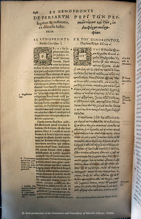 In addition to the two copies of this 1592 Herodotus at Marsh’s library, there are also two others in Dublin. The Edward Worth library has one copy. Worth, a Dublin physician (1678-1733), appears to have been the third owner of the edition (the first, Henry Price (1566-1600), was a scholar and preacher in Oxford; the second was one W. Percivale). Trinity College Dublin has the other copy. Indeed the volume is well represented in libraries around Europe and in major North American collections. It is a monument both to Estienne’s skills as a scholar and as a publisher and a testament to the interest in what the ancients had to say about the ancient Persians. Estienne and his circle, in particular Joachim Camerarius, were instrumental in bringing about a change of fortune in the way Herodotus was viewed and this volume presents the sum of their scholarly work over the course of the 16th century.